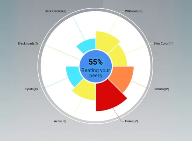 Zanimljiv izračun crta lica (vrijednost lica, oblik lica, oblik očiju, oblik usta, omjer dužine lica i omjer širine lica), mapa strukture kože, površinska sveobuhvatna indikatorska karta, duboka sveobuhvatna indikatorska mapa, atributi kože, pregled kože, starost kože predviđanje, sveobuhvatni pregledi i preporučeni scenariji.
