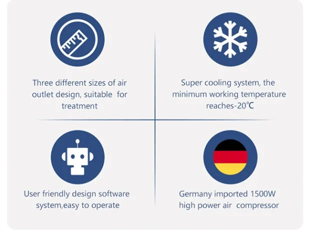 Mašina za hlađenje vazduha je sistem za hlađenje kože specijalno dizajniran za plitku lasersku hirurgiju kože, koji smanjuje lasersku bol i termička oštećenja, hladi epidermu male veličine i može se fleksibilno koristiti. Idealan je sistem hlađenja za hlađenje kože u laserskim aplikacijama i bilo koji oblik injekcije